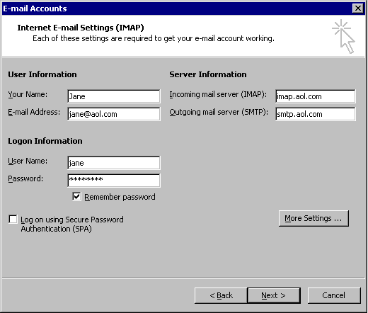 - Outgoing mail server (SMTP): smtp.aol.com.